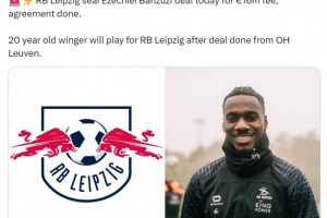 羅馬諾指出,萊比錫對效力于比利時俱樂部奧哈瓦里的班祖齊感興趣,并已經(jīng)就球員的轉會交易達成協(xié)議,轉會費1600萬歐元。交易完成之后,班祖齊將為萊比錫俱樂部效力。