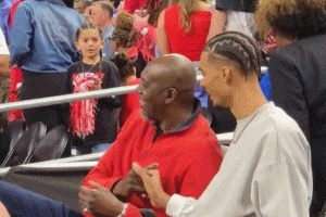 文班亞馬被拍到來到場邊看球,并與火箭名宿“大夢”奧拉朱旺并排坐,兩人聊了幾句。