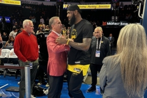 現阿肯色大學男籃主帥、前肯塔基大學名帥卡利帕里來到現場觀戰(zhàn),并與詹姆斯擁抱互動。