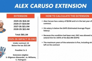 薪資專家Bobby Marks曬出卡魯索合同詳情,卡魯索本賽季工資1000萬低于聯(lián)盟平均工資,他新合同的起薪,也就是2025-26賽季所能夠得到的最大工資是本賽季聯(lián)盟平均工資*140%,也就是1293*1.4=1810.2萬美元,續(xù)約合同最大年限為5年,但包括本賽季的到期合同在內(nèi)。