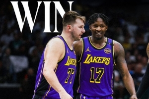 賽后湖人官方曬出贏球海報(bào),擊敗舊主的東契奇和芬尼-史密斯登上封面。