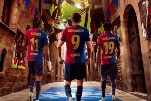海報(bào)內(nèi)容為拉菲尼亞、萊萬(wàn)、亞馬爾走在歐冠的道路上,而他們的前方是蘇亞雷斯、梅西、內(nèi)馬爾手捧歐冠獎(jiǎng)杯的場(chǎng)景。