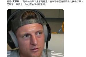 但實際上,這條視頻其實是克羅斯在歐冠1/4決賽首回合開始前,預(yù)測各場比賽的比分:“阿森納踢皇馬,我覺得我就不預(yù)測了吧,如果不以皇馬球迷的身份,我認(rèn)為首回合會以平局收場,然后在伯納烏的次回合決勝負(fù)——這種劇情我們見過很多次了。