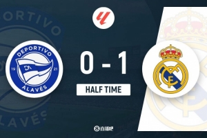 上半場比賽結(jié)束,十人皇馬客場暫時1-0領(lǐng)先阿拉維斯。