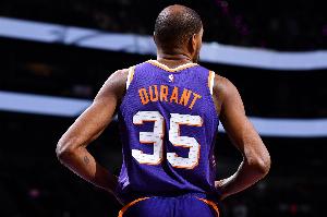 本賽季,太陽球星杜蘭特依然攻防兩端拼盡全力,出戰(zhàn)62場場均36.5分鐘拿到26.6分6籃板4.2助攻1.2蓋帽,三項(xiàng)命中率分別為52.7%、43%、83.9%。