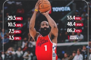上周,哈登率領(lǐng)快船取得了4勝0負的戰(zhàn)績,場均可以轟下29.5分7.5籃板10.5助攻1.5搶斷,投籃命中率53.4%,三分命中率48.4%,罰球命中率86.2%。