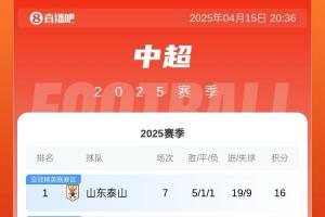 體育資訊04月15日訊 北京時(shí)間18:30,中超第7輪,泰山5-1西海岸。本場(chǎng)比賽過(guò)后,泰山先賽5勝1平1負(fù)共計(jì)16分暫登頂中超積分榜,領(lǐng)先申花2分。
