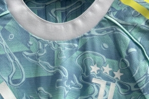 這款球衣以青綠色為主色調(diào),設(shè)計上采用了抽象的波浪和幾何圖案,呈現(xiàn)出流動感和現(xiàn)代感,球衣胸前有尤文隊徽標(biāo)志,點綴三顆白色星星,另有阿迪達(dá)斯標(biāo)志。