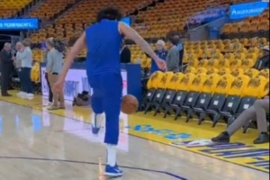 賽前,勇士球員蓋-桑托斯大秀腳法,他絲滑顛球后轉(zhuǎn)身射落三分,手感和腳感都很出色。