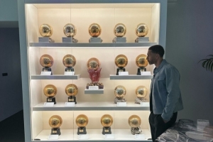 該獎(jiǎng)柜正中央成列的是歷史上唯一的超級(jí)金球獎(jiǎng),1989年由皇馬傳奇迪斯蒂法諾獲得。