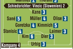 中場:格雷茨卡(4)、基米希(5)、薩內(nèi)(5)、穆勒(4)、奧利塞(3)