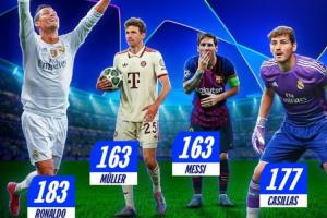 穆勒在歐冠的出場數(shù)排名賽事歷史并列第三位,僅少于C羅(183)、卡西(177)。在此前162場歐冠比賽中,穆勒打進(jìn)57球,助攻34次。