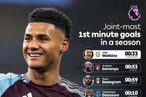 據(jù)英超官方統(tǒng)計,英超本賽季出現(xiàn)10粒開場1分鐘內(nèi)的進(jìn)球,追平2022-2023賽季創(chuàng)造的紀(jì)錄。