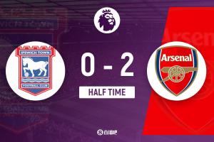 半場戰(zhàn)罷,阿森納暫2-0伊普斯維奇。