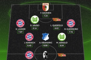 體育資訊4月21日訊 德甲第30輪全部戰(zhàn)罷,數據網站Whoscored盤點了本輪比賽評分最高陣容,其中凱恩領銜鋒線、基米希、克拉馬里奇在列,具體如下: