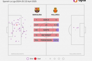 據(jù)Opta統(tǒng)計,巴薩本場比賽射門40次,追平03-04賽季有統(tǒng)計以來西甲單場比賽射門紀(jì)錄。2011年皇馬對陣薩拉戈薩的比賽,皇馬射門40次。
