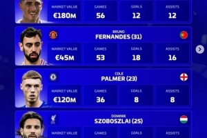 德轉(zhuǎn)評(píng)選年度最佳前腰名單:貝林厄姆、B費(fèi)、帕爾默、索博斯洛伊