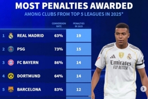 2025年五大聯(lián)賽俱樂部獲得點(diǎn)球榜:皇馬19次、巴黎15次、巴薩12次
