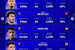 德轉(zhuǎn)評(píng)選年度最佳中前衛(wèi)名單:麥克托米奈、內(nèi)維斯、佩德里、賴斯