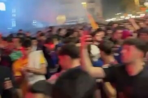 眾多巴薩球迷來到巴塞羅那卡納雷特斯噴泉(巴薩慶祝常用場地),慶祝球隊(duì)奪冠。