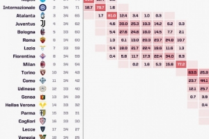 根據(jù)Opta超級計算機的預測,那不勒斯有81.3%概率贏得本賽季意甲冠軍,國米奪冠概率為18.7%。