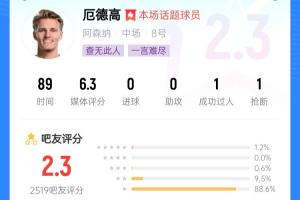 凌晨歐冠半決賽首回合,阿森納主場0-1巴黎,本場比賽厄德高首發(fā)出場89分鐘但表現(xiàn)糟糕,沒有射門,6次嘗試過人僅一次成功,吧友給他打出了2.3分的超低分。