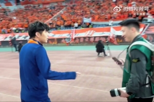 中超第10輪,泰山主場1-1戰(zhàn)平海牛,本場比賽,海牛教練組成員蒿俊閔重返泰山主場,他賽后也來到場邊謝場,并與泰山球員致意。