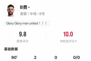 體育資訊5月2日訊 歐聯(lián)杯半決賽首回合,曼聯(lián)客場3-0畢爾巴鄂競技。本場比賽B費首發(fā)出戰(zhàn),貢獻(xiàn)2粒進(jìn)球,送出3次關(guān)鍵傳球,評分9.8全場最高。