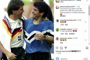 馬特烏斯社媒曬出與馬拉多納的合照,配文:“這張照片拍攝于1990年決賽的前一天,在奧林匹克球場的最后一場訓(xùn)練?!?/p>