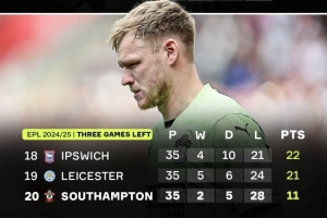 此役過后,南安普頓2勝5平28負(fù)積11分,仍與德比郡2007-2008創(chuàng)造的英超最低積分紀(jì)錄持平,南安普頓本賽季剩下三輪比賽的對(duì)手是曼城、埃弗頓和阿森納。