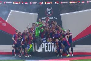 體育資訊01月13日訊 西超杯決賽,巴薩5-2戰(zhàn)勝皇馬奪冠。賽后,巴薩教練組和球員上臺(tái)領(lǐng)取冠軍獎(jiǎng)牌。