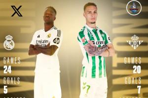 貝蒂斯社媒為圖片配文:自從GOAT加盟貝蒂斯以來,維尼修斯與安東尼的數(shù)據(jù)對比??在我看來金球獎競爭者只有一個????