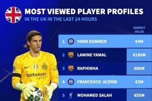 德國轉(zhuǎn)會(huì)市場列出了過去24小時(shí)球員資料在英國的瀏覽次數(shù)排名,國米門將索默居首,前7名國米球員占4席。