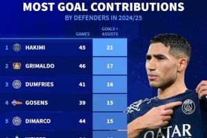 體育資訊5月8日訊 德國(guó)轉(zhuǎn)會(huì)市場(chǎng)統(tǒng)計(jì)了本賽季五大聯(lián)賽后衛(wèi)的參與進(jìn)球數(shù)量,并列出榜單,阿什拉夫21球居首,格里馬爾多、鄧弗里斯排名二三位。
