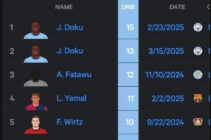 體育資訊5月9日訊 StatMuse FC統(tǒng)計本賽季五大聯(lián)賽單場過人次數(shù)排行,曼城邊鋒多庫占據(jù)前二,亞馬爾第四。