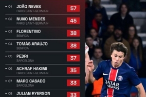 1.若昂-內(nèi)維斯(巴黎圣日耳曼)— 57次