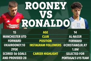 本周葡萄牙足協(xié)公布了新一期U15國家隊的名單,C羅的兒子,效力于利雅得勝利青年隊的克里斯蒂亞諾-多斯-桑托斯(迷你羅)入選。而C羅老隊友魯尼的兒子同樣天賦異稟,《太陽報》將兩人放在一起對比。