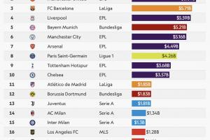 美媒盤點足壇俱樂部估值TOP20(單位:美元):