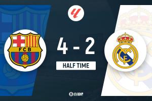 上半場比賽結(jié)束,巴塞羅那主場暫時4-2領(lǐng)先皇家馬德里。