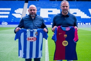 巴薩主帥弗里克、西班牙人主帥馬諾洛-岡薩雷斯賽前見面,并互換兩隊(duì)球衣,巴薩官方社媒曬出兩位教練的合照。