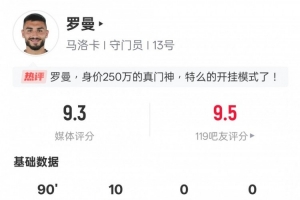 體育資訊5月15日訊 西甲第36輪,馬洛卡1-2不敵皇馬。馬洛卡門將羅曼本場比賽首發(fā)出戰(zhàn),10次撲救全場最多,評分9.3全場最高。