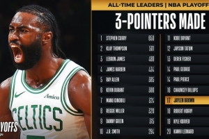 首節(jié)布朗命中2記三分,生涯季后賽三分?jǐn)?shù)來到262個(gè),超越羅伯特-霍里升至歷史第17位。