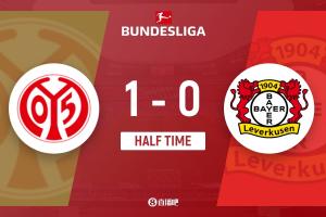 半場結(jié)束,美因茨1-0勒沃庫森。