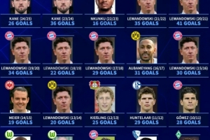 體育資訊5月20日訊 本賽季凱恩以26球蟬聯(lián)德甲射手王,德轉(zhuǎn)也盤點了德甲近20個賽季最佳射手,具體如下: