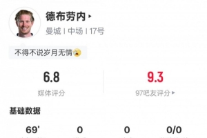 體育資訊5月21日訊 英超第37輪,曼城對(duì)陣伯恩茅斯,德布勞內(nèi)主場(chǎng)告別戰(zhàn)首發(fā)登場(chǎng),送出2次關(guān)鍵傳球,但也錯(cuò)失1次進(jìn)球機(jī)會(huì),評(píng)分6.8。