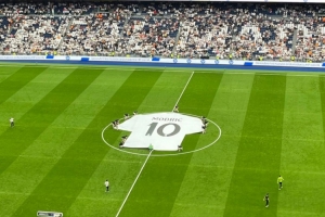本場(chǎng)比賽是皇馬傳奇中場(chǎng)莫德里奇的主場(chǎng)告別戰(zhàn),賽前,皇馬在伯納烏向莫德里奇致敬,他們?cè)谇驁?chǎng)中圈曬出莫德里奇的巨型10號(hào)球衣。