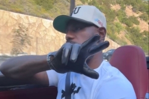 詹姆斯轉發(fā)了他的朋友發(fā)布的一段自拍,他和友人坐在一輛敞篷跑車上前往郊區(qū)兜風,車上音響同時播放著音樂。