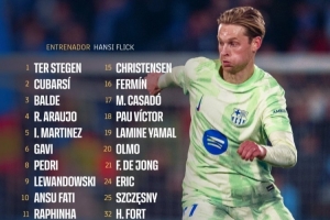 體育資訊5月25日訊 北京時間明天凌晨3點,西甲第38輪巴薩客戰(zhàn)畢爾巴鄂競技,巴薩公布此役大名單。亞馬爾、拉菲尼亞在列,阿勞霍回歸,孔德、費蘭-托雷斯等缺席。