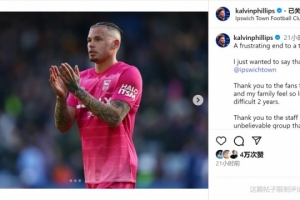 菲利普斯本賽季被曼城外租至伊普斯維奇,租借合同今夏到期,菲利普斯社媒曬出身穿伊普斯維奇球衣的照片,并寫道:“這是一個艱難賽季的令人沮喪的結(jié)局。我只想對伊普斯維奇說聲謝謝。