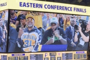 體育資訊5月28日訊 今日東決G4步行者主場對(duì)尼克斯,前步行者球員史蒂芬森來到場邊觀看比賽,并對(duì)著鏡頭打出一套組合拳。
